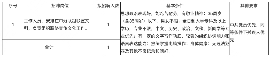 市残疾人联合会二层机构辅助管理岗位人员1人,所招聘人员为聘用性质,详见下表: