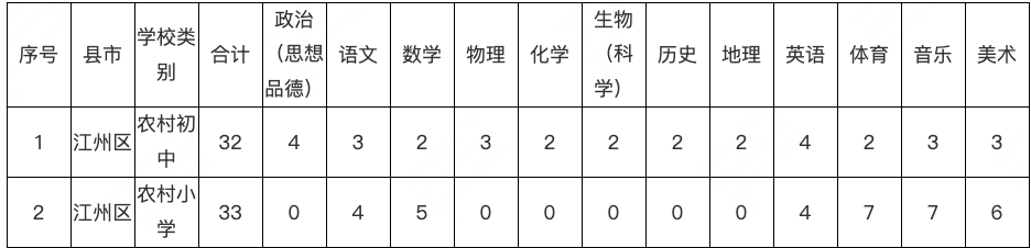 根据自治区教育厅、编办、财政厅、人社厅四部门《关于做好2024年特岗教师招聘工作的通知》(桂教特岗〔2024〕1号)精神,2024年崇左市江州区计划免笔试招聘特岗教师65名。现将相关事项公告如下:
